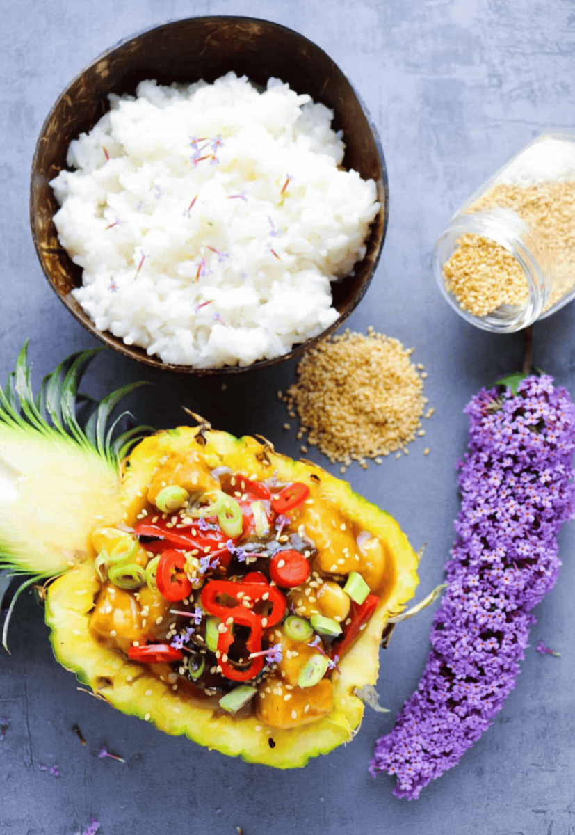 Crispy tofu bites are tossed with colourful bell peppers and juicy pineapple chunks in a tangy, sweet, and savoury sauce. The pineapple bowl adds a tropical flair, making this dish a visually stunning and flavourful vegan treat.