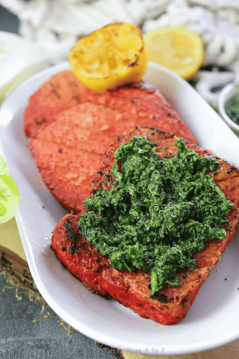 Another fish dish starring a humble block of tofu is this amazing vegan salmon cleverly marinated and simply pan fried, served with a gorgeous caper & parsley salsa verde.