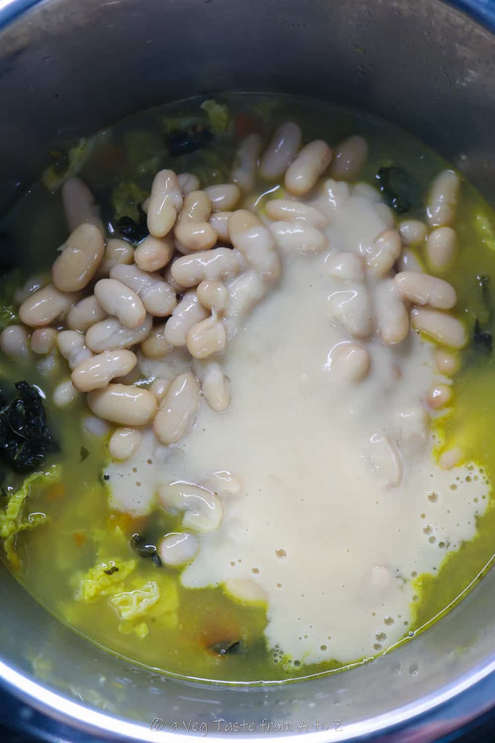 4. Give the Instant Pot a quick steam release, then add the whole canned cannellini beans (with the juice) and the blended ones.