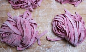 The beetroot dough it's simply obtained by kneading half all purpose flour and half semolina flour, a pinch of salt and beetroot juice, and let the dough rest for at least 30 minutes (can be stored in the fridge covered in film up to 3 days).