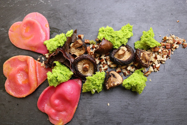 Heart Shaped Beetroot Ravioli filled with Tumeric, Truffle and Ginger sauce (half spheres of sauce coated in a calcium chloride solution), Parsley, Garlic and Thyme Sponge, sautéed Shiitake, Chestnut and Black Fungus Mushrooms in Truffle Oil on a soil of Roasted Pecans;