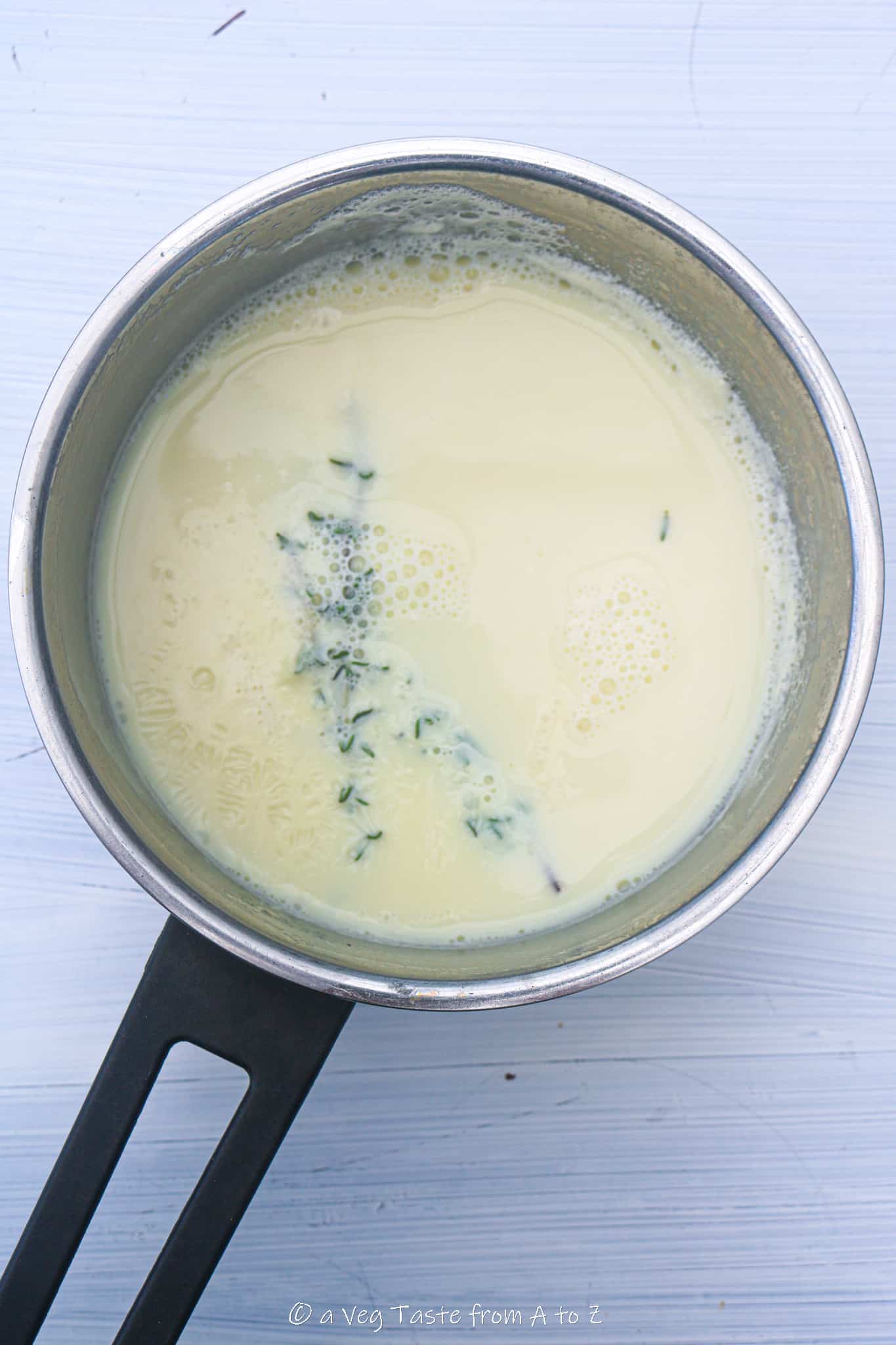 For the sauce simply heat the milk with a bunch of thyme. Reduce the heat and simmer for 5 minutes.