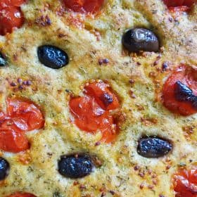 This delicious focaccia bread simply consists of a fluffy dough enriched with potatoes and seasoned with olive oil, fresh tomatoes, olives and oregano.