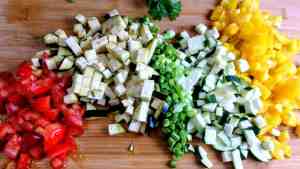 2. Heat the oil in a pan, then add the cubed vegetables except for the tomatoes. Season with salt and pepper and sauté until soft and caramelized. Once cooked add the cubed tomatoes.