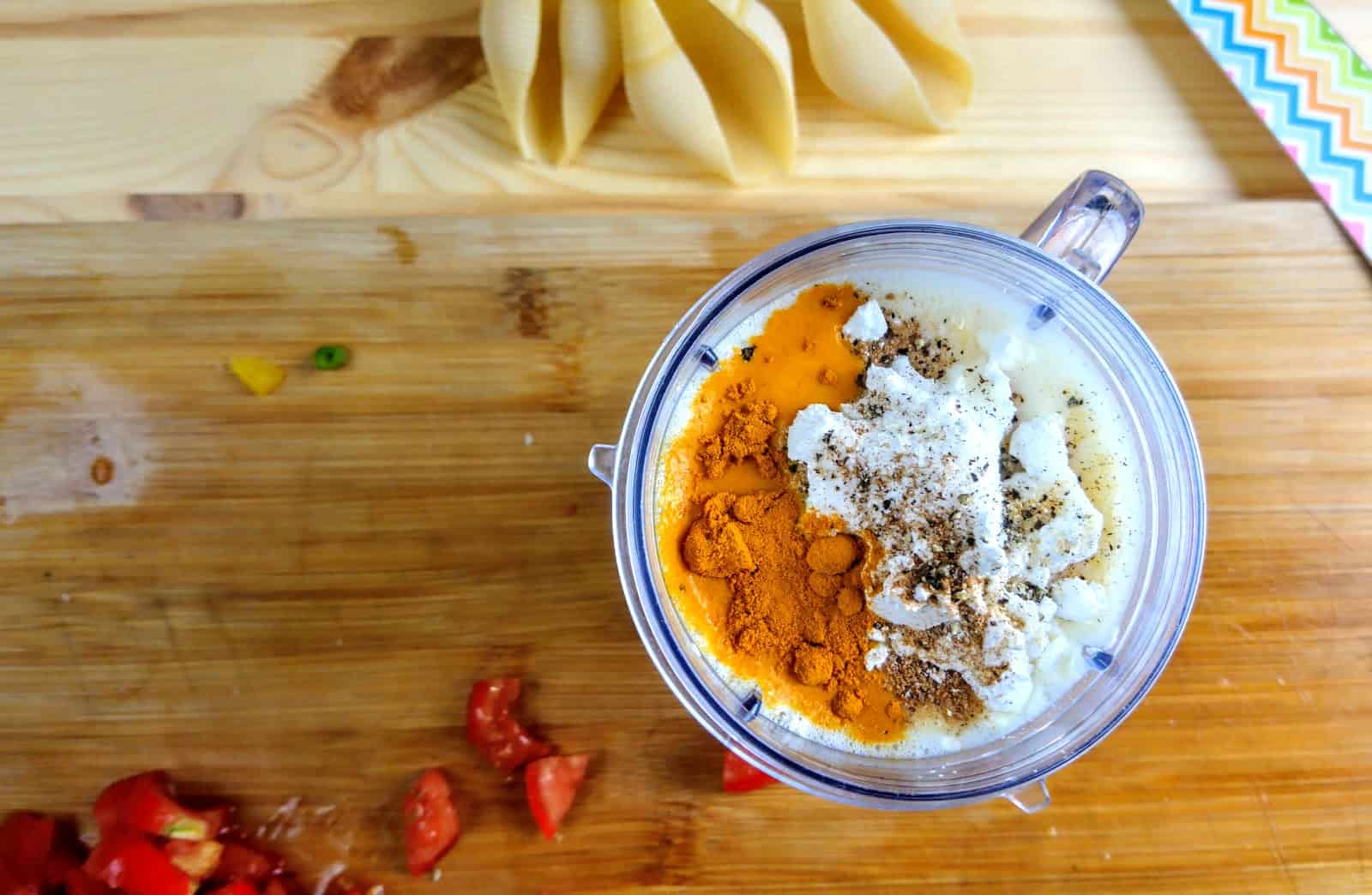 3. In the mean time roughly chop the remaining yellow pepper, place it into a blender cup, then add milk, corn flour, turmeric, garlic powder and salt. Blend until smooth.