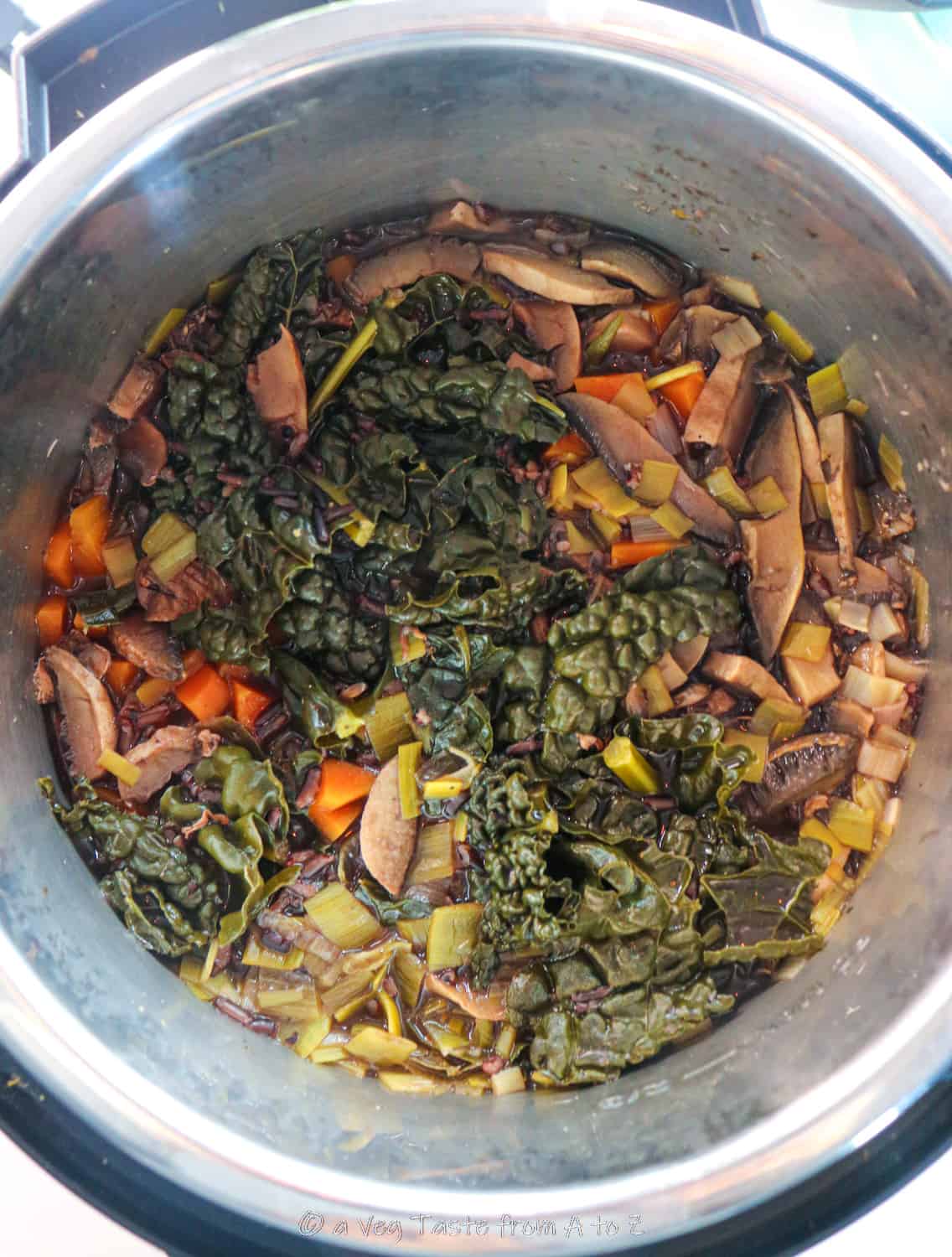 Cut the vegetables: the leek, mushrooms and carrots in 1cm sized chunks and add to the Instant Pot. To this add all the other ingredients *including the rice to the Instant Pot and cook for 15 minutes.