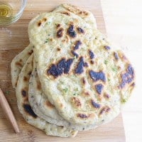 Once the naan is cooked brush it with some vegetable oil whilst it is still hot and sprinkle over some salt (if you like), some garlic paste and/or herbs such parsley, coriander, thyme, or simply leave it plain. Pile every naan up, then cover with foil to keep the naans warm until you finish cooking the remaining ones.