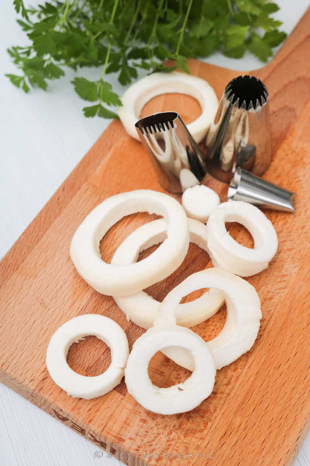 Ora, prendete una manciata di beccucci per sac a poche o taglia biscotti rotondi con diametri di diverse dimensioni, e andate a praticare dei buchi al centro di rondella di funghi. Il disco centrare delle rondelle più grandi può essere forato ulteriormente per creare degli altri "calamari" più piccoli.