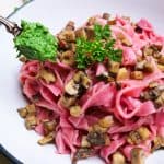 Tagliatelle alla Rapa Rossa con Ragù di Funghi e pesto di Prezzemolo&Spinaci