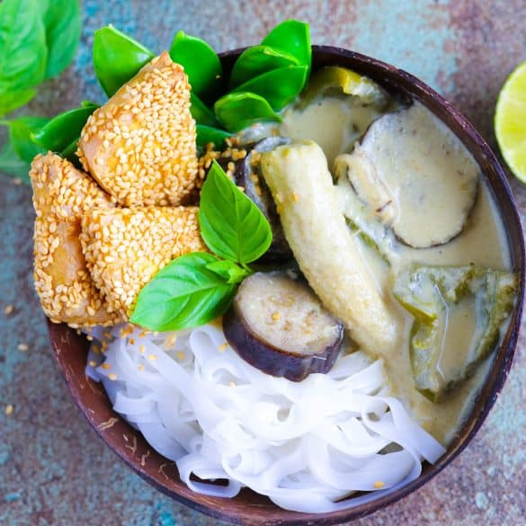 La mia versione del classico curry verde thailandese servito con tofu al sesamo croccante e tagliatelle di riso: un'esplosione di sapori!