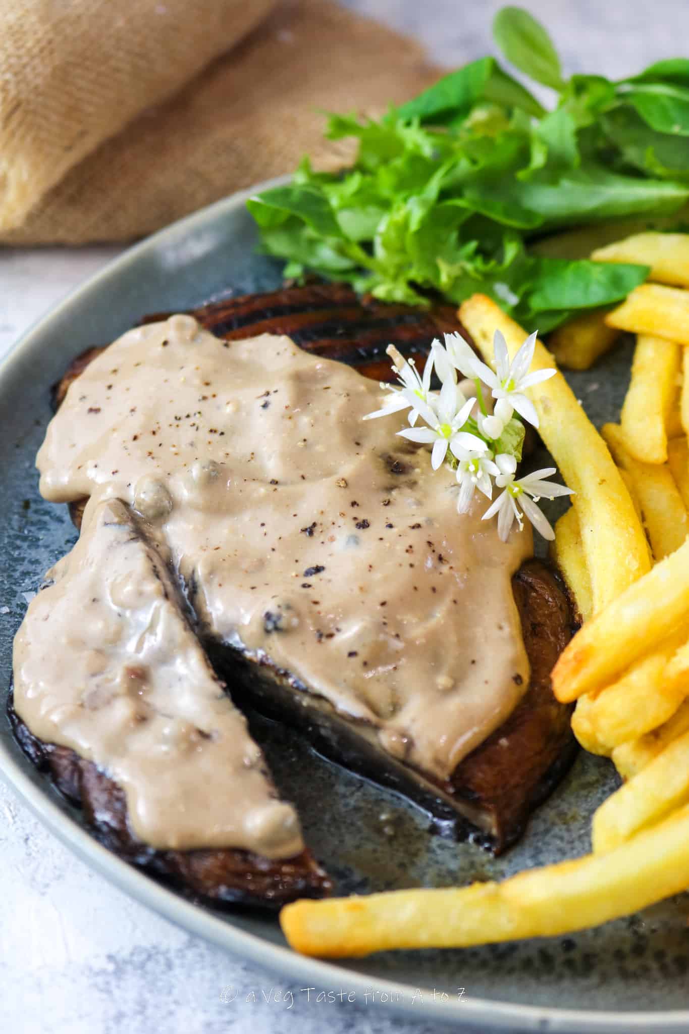 Questi Funghi Portobello Grigliati sono accompagnati da una Salsa al Pepe Nero e Brandy: super gustosi e carnosi, sono perfetti per le grigliate in famiglia.