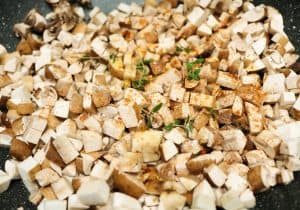 Affettiamo i funghi a dadini e saltiamoli in padella a fuoco medio con olio, aglio tritato, peperoncino, sale, pepe e timo.