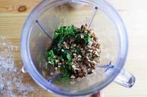 Nota: se usate gli spinaci surgelati, scongelateli e cuoceteli al microonde per un paio di minuti prima di formare il pesto; se avete optato per quelli freschi, appassiteli in padella o al microonde per qualche minuto, sminuzzateli grossolanamente e aggiungeteli al bicchiere del frullatore.