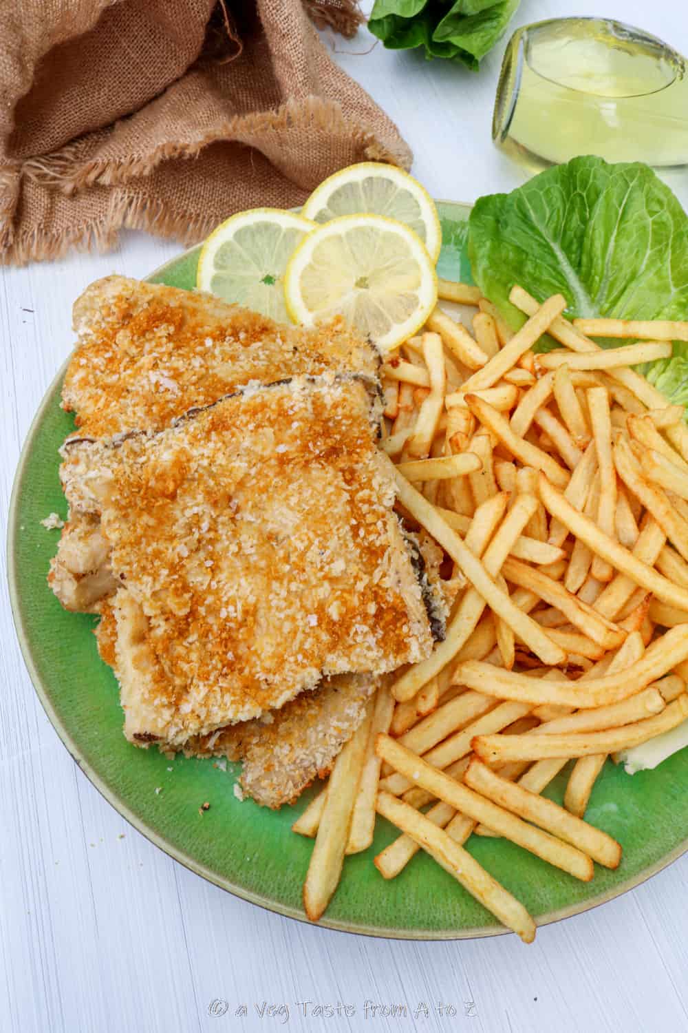 To cook the King Oyster Mushroom Cutlets all we need to do is to place the coated mushrooms in the air fryer basked, previously oiled (I use this handy oil sprayer) and set the timer for 7 minutes at 180° C (350° F). After the first timer, flip the cutlets, lightly spray with some extra vegetable oil and cook for another 5 minutes at the same temperature.