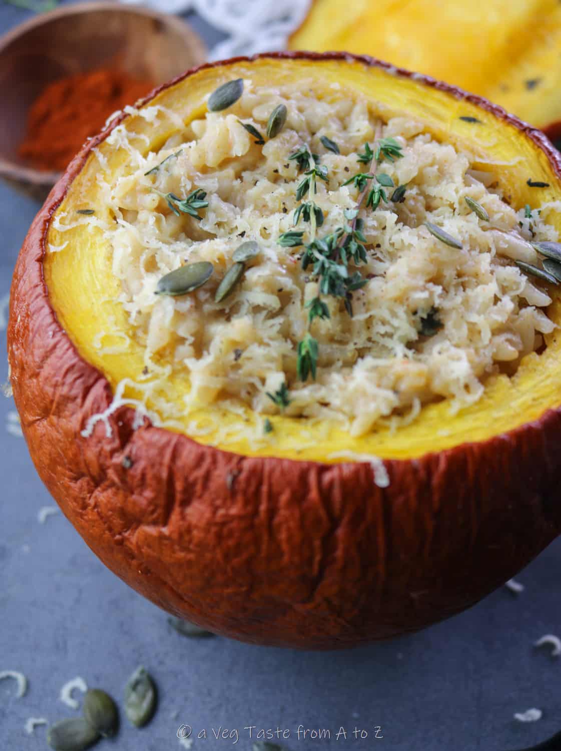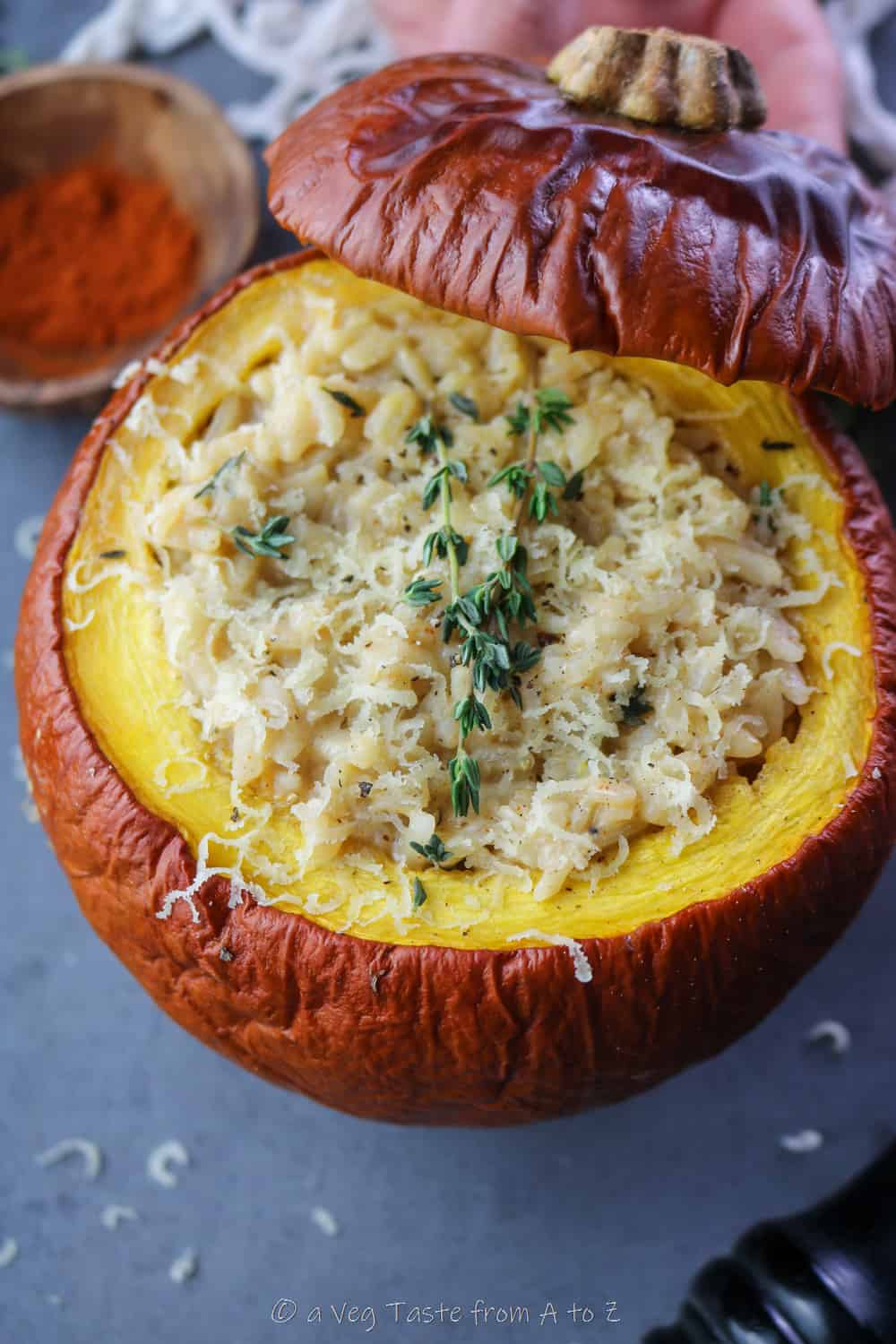 9. Serve the risotto and top with some pumpkin pulp scraped off the sides. You can also top with a kiss of olive oil or vegan grated cheese. Alternatively, serve the pumpkin with its lid to the table, so that people can help themselves.