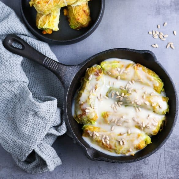 Nourishing savoy cabbage rolls with butternut squash and red lentils filling topped with a creamy white sauce. Perfect both as a starter or main.