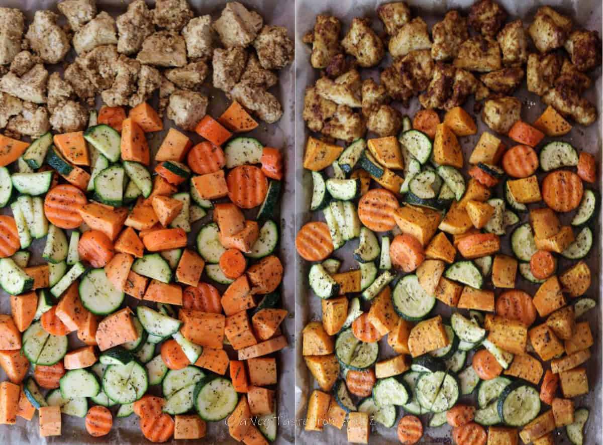 To season the vegetables, I kept is simple just by using dried basil for a herbal note and peri peri salt for a kick. Again, feel free to customize it by using your favourite spices and herbs.