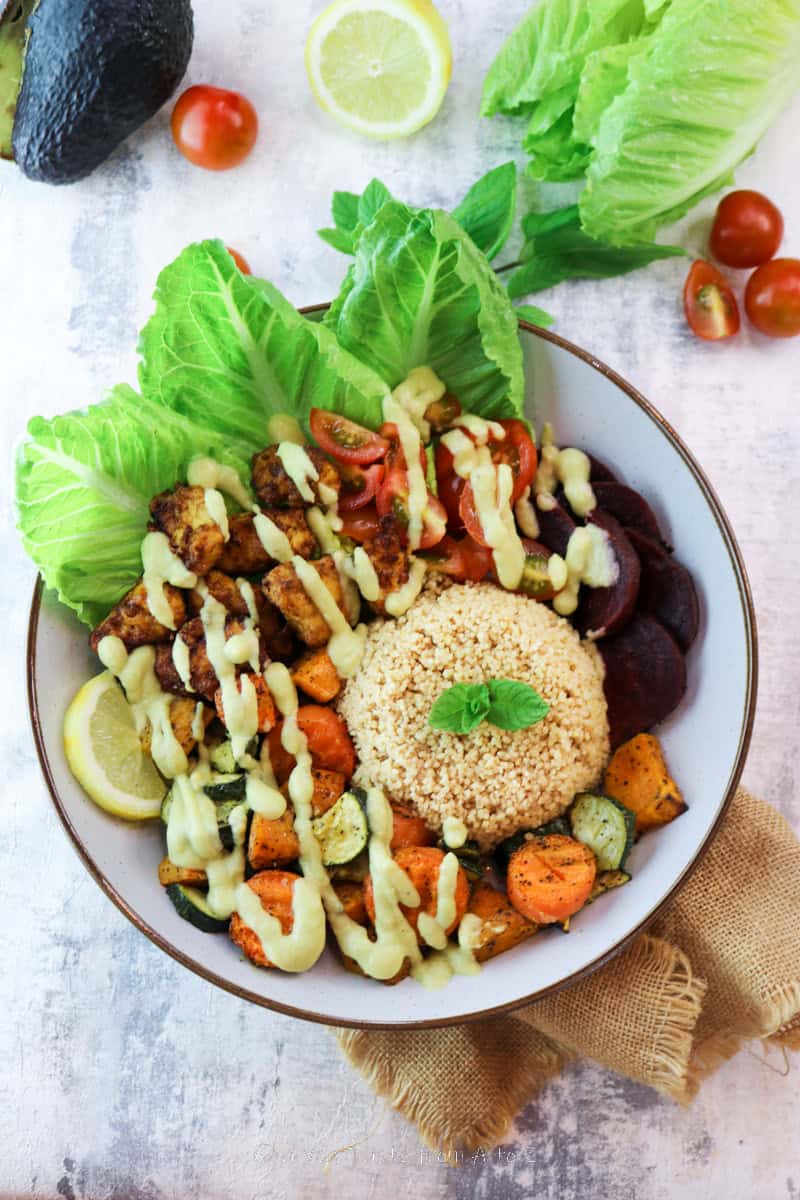 Packed with colourful roasted vegetables, protein-rich tofu, fluffy wholemeal couscous and a creamy, zesty dressing — it’s a complete meal that tastes as good as it looks.