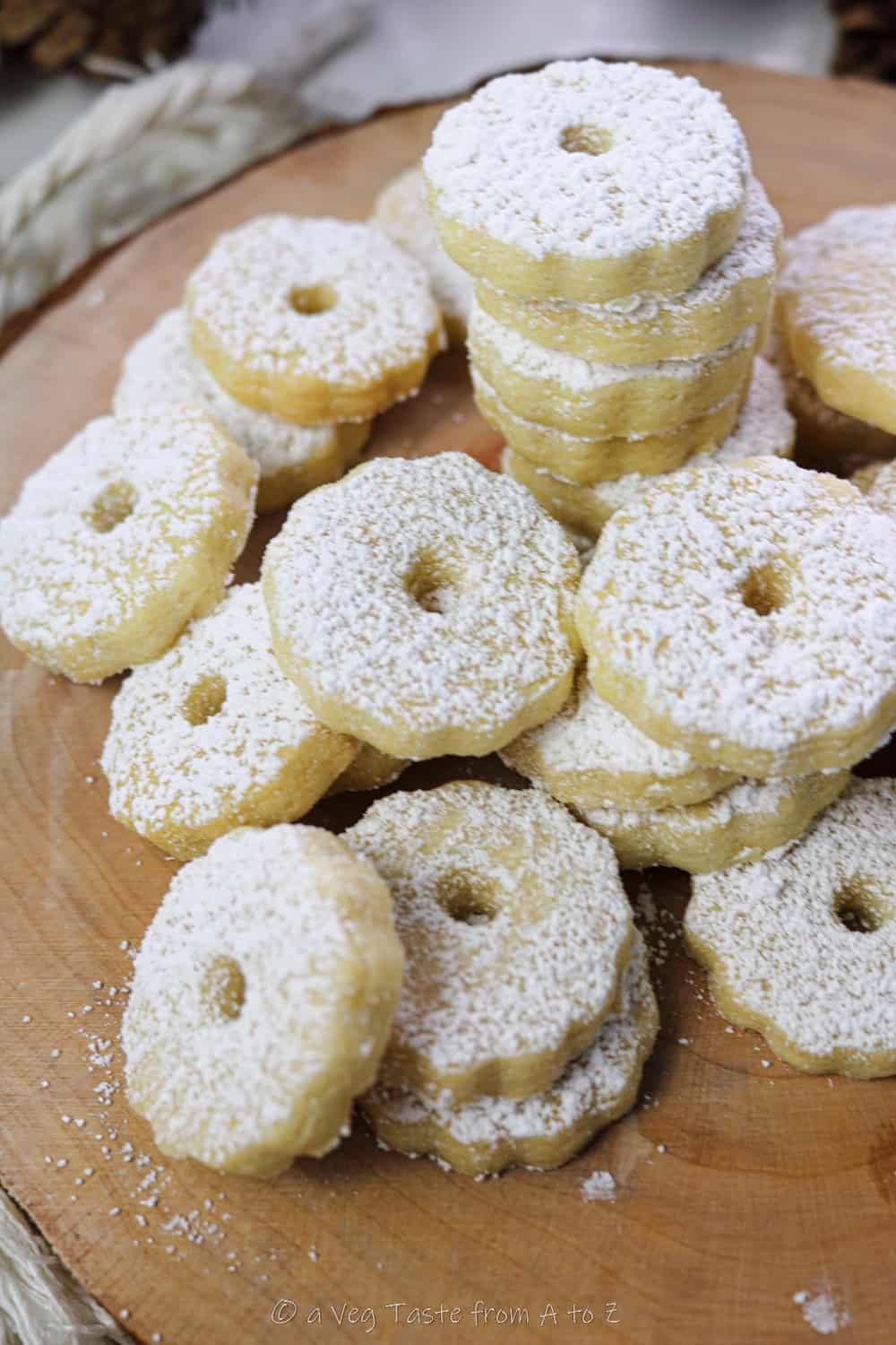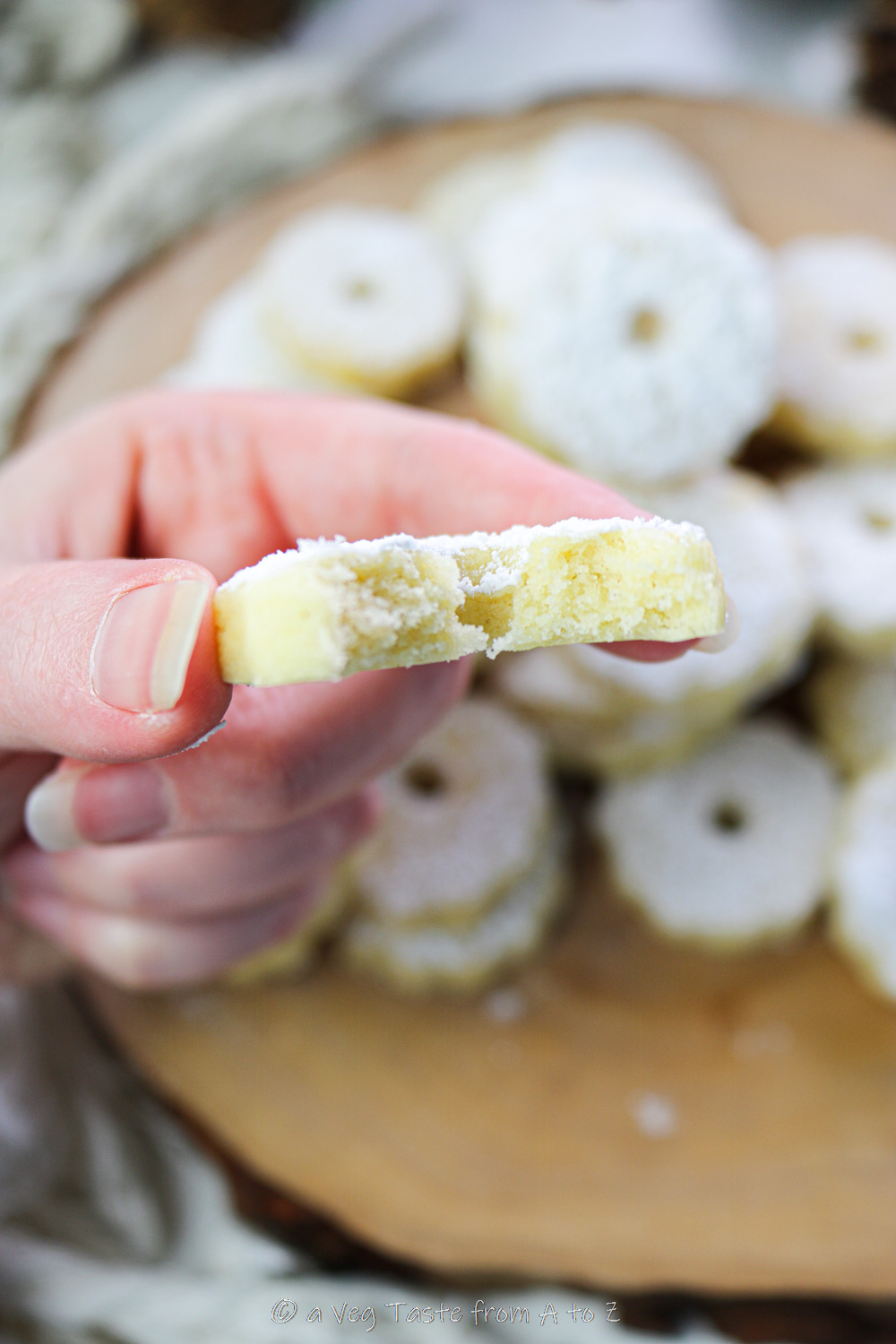 Amongst the key ingredients there were two non vegan elements to the original recipe: butter and hard boiled egg yolks, which aided in making them short and crumbly.