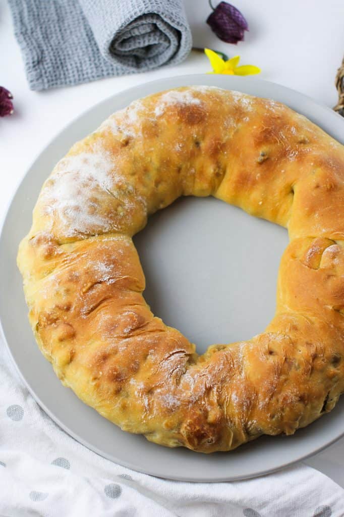 Roll the dough lengthwise to form a big sausage, then transfer on a (preferably round) baking tray in the shape of a doughnut.