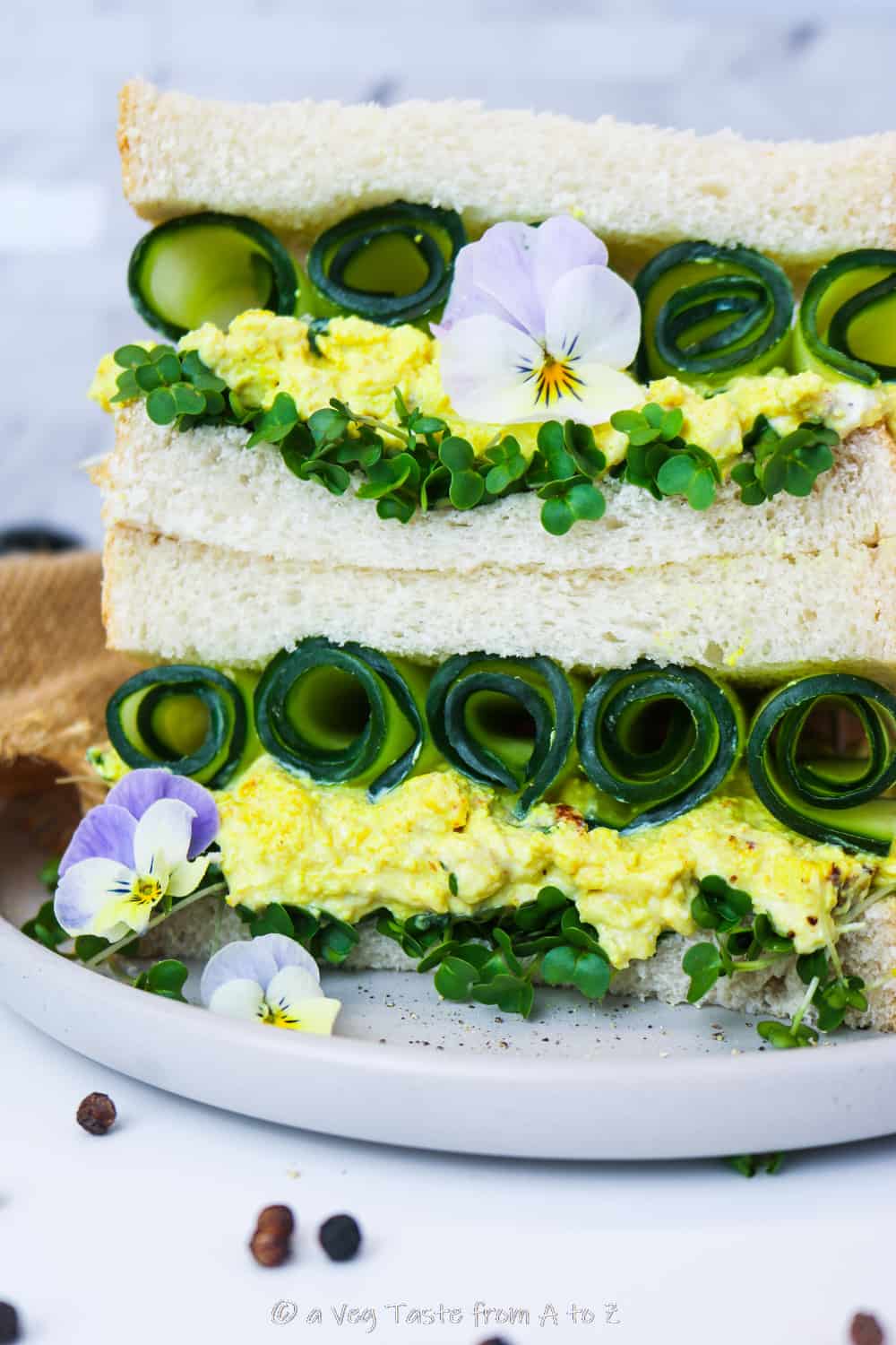 Then, cut the sandwiches however you might like and enjoy them straight away! We love to serve these as part of a vegan afternoon tea if weโre trying to be fancy, so go ahead and cut the sandwiches into fingers if youโd like.