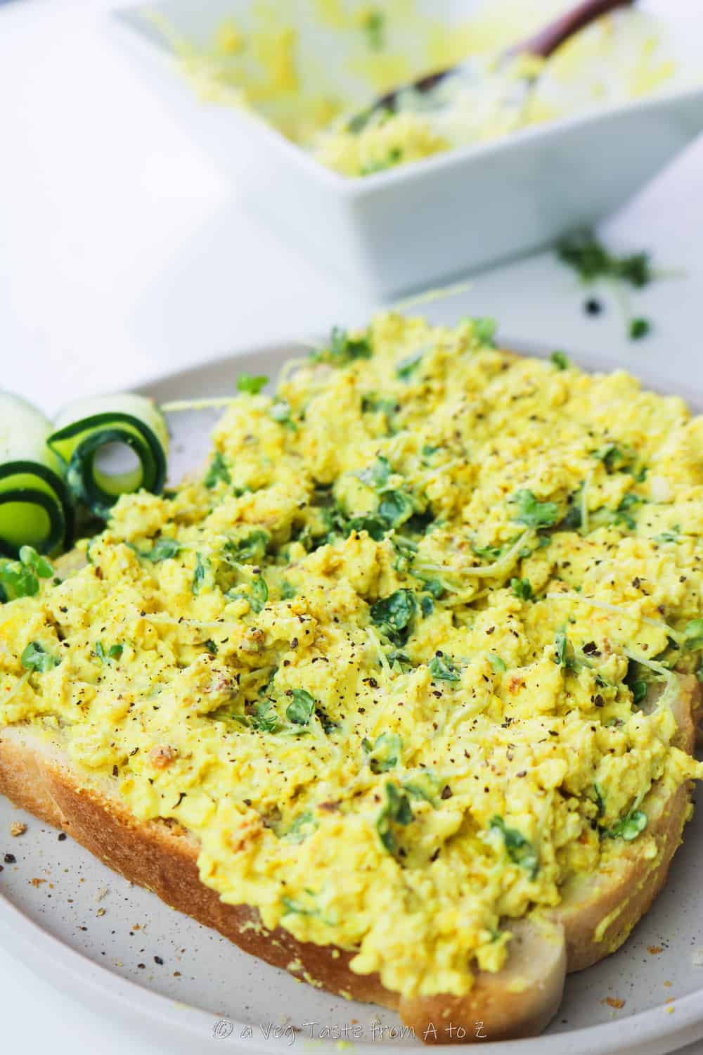 First things first, youโll need to make the vegan scrambled eggs according to this recipe. Itโs a really simple recipe, and itโs one that Iโve had a lot of compliments on over the time since I made it - give it a go! Once youโve made the vegan scrambled eggs, let them cool completely to room temperature.