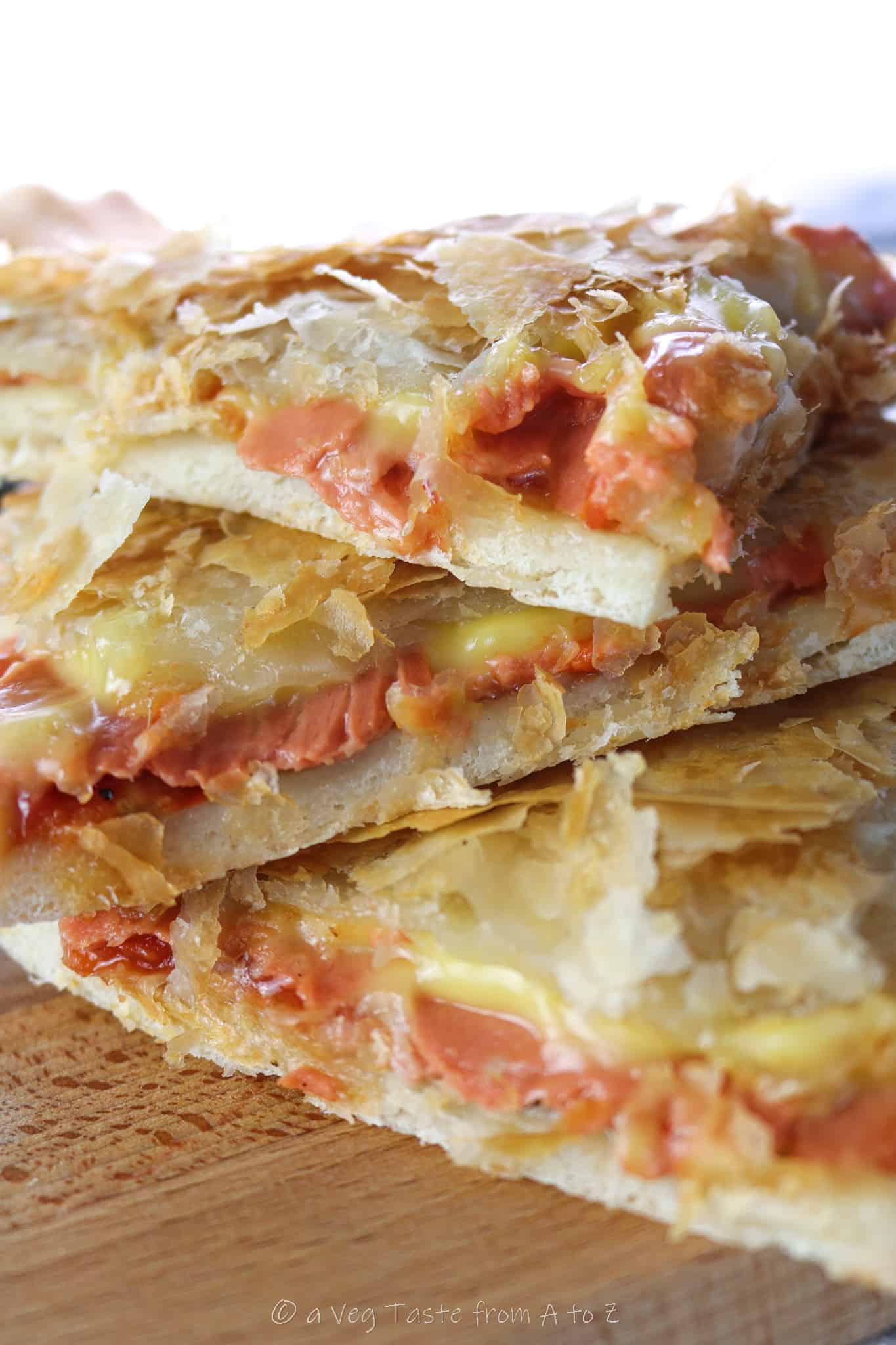 The beautiful crispy flaky texture of the pastry with the thin dough of the pizza base create a gorgeous sandwich for the fillings. This two dough combo gives this easy-to-make rustic pizza a unique and an extremely delicious flavor!
