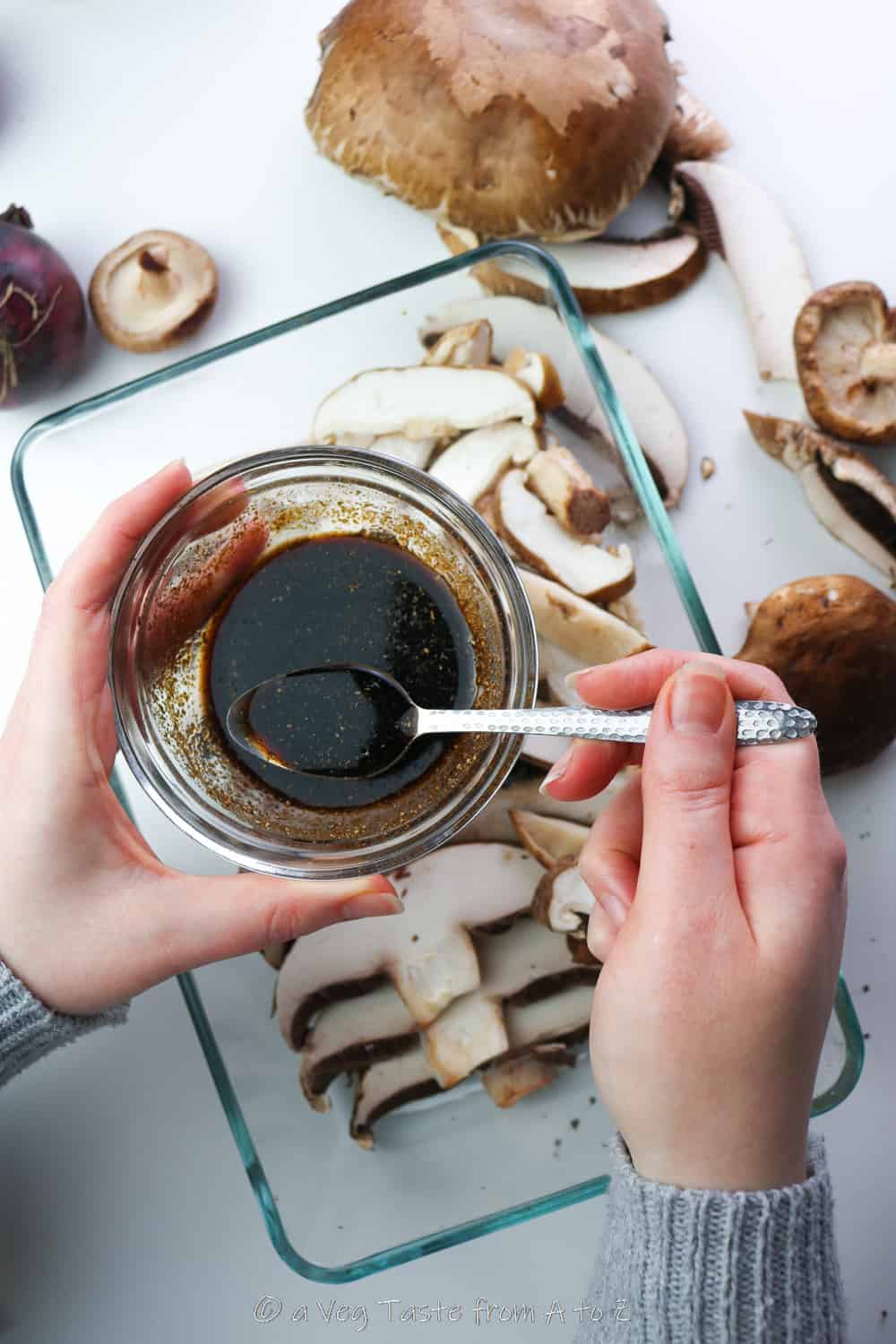 Combine all of the marinade ingredients in a small bowl, and whisk them together briefly. Pour this mixture over the mushrooms, and then allow them to marinate for a minimum of thirty minutes, though overnight would be best.
