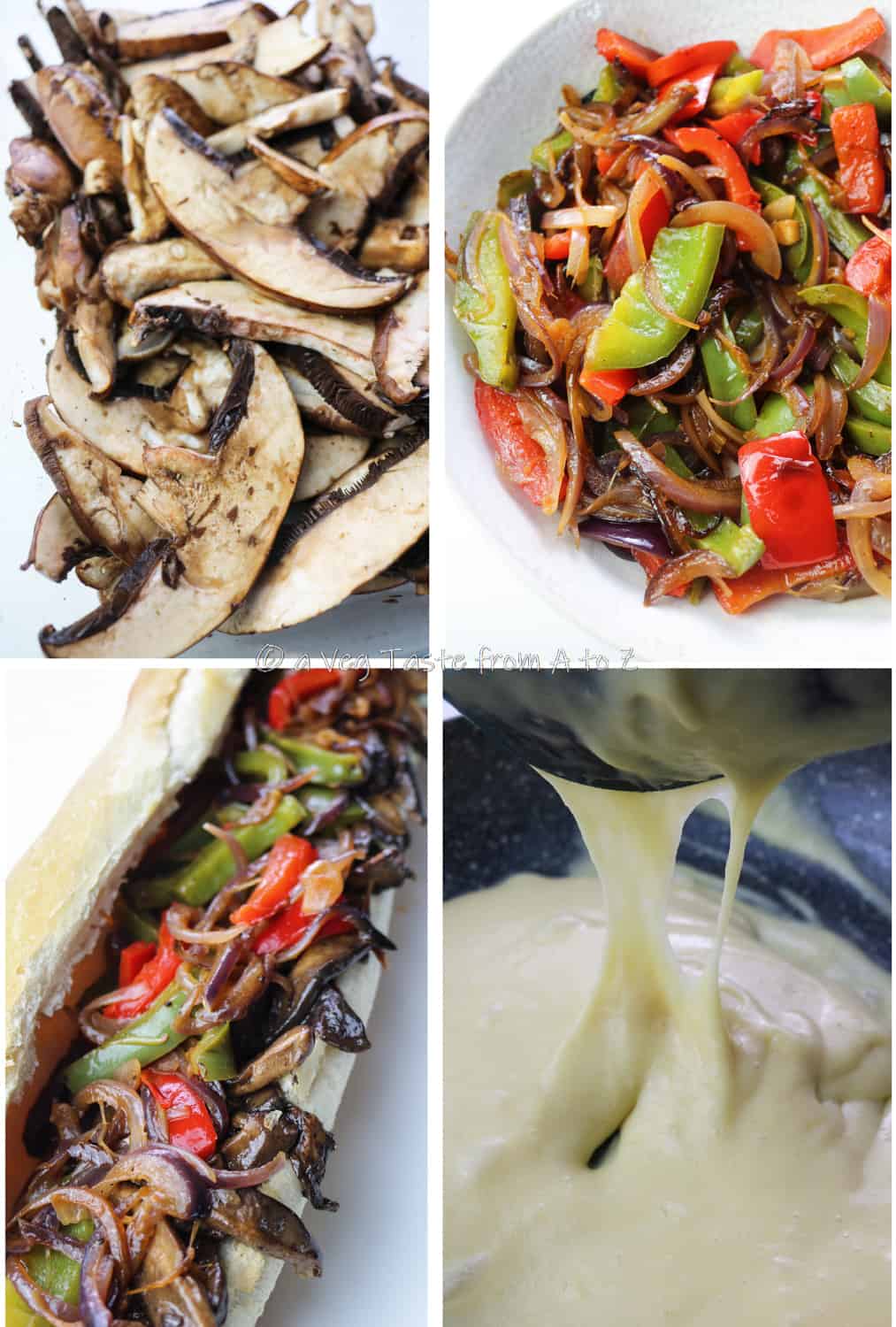 Finally, assemble the vegan Philly ‘cheesesteak’ - place the cooked mushrooms on the bottom of the sandwich, followed by some of the sautéed veggies. Finally, finish the sandwich with the vegan cheese sauce - we won’t tell anyone if you deliberately put a bit too much on…