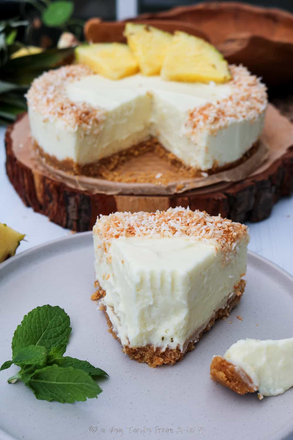15. Serve the Vegan Piña Colada Cheesecake with slices of fresh pineapple.