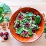 Pour the pasta in a serving dish and top with the cherries halves, a sprinkle of mixed seeds, some freshly grated pepper and, if you fancy, some more nutritional yeast.