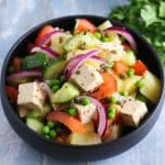 Hearty, summery and refreshing potato salad with tofu, tomato, cucumber, peas and capers. Perfect as a side dish or a main.