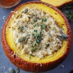 Serve the risotto and top with some pumpkin pulp scraped off the sides. You can also top with a kiss of olive oil or vegan grated cheese. Alternatively, serve the pumpkin with its lid to the table, so that people can help themselves.